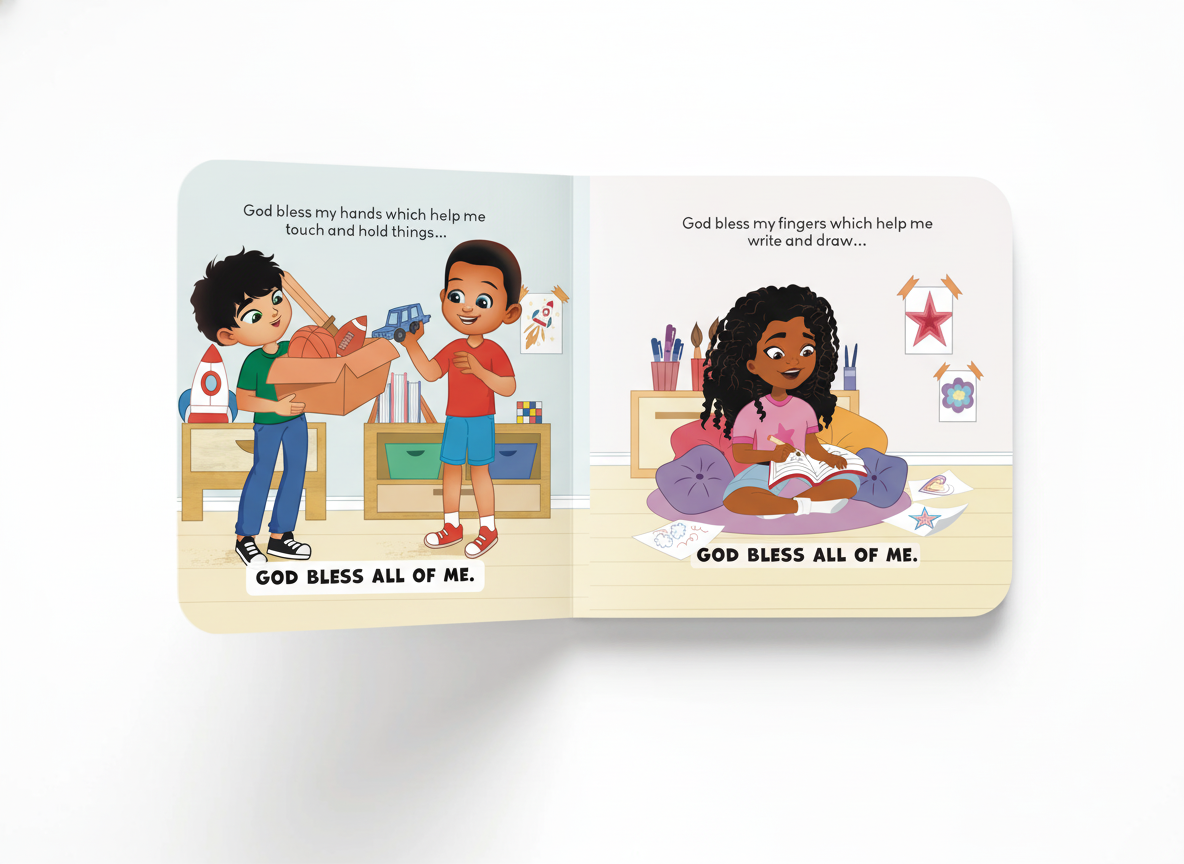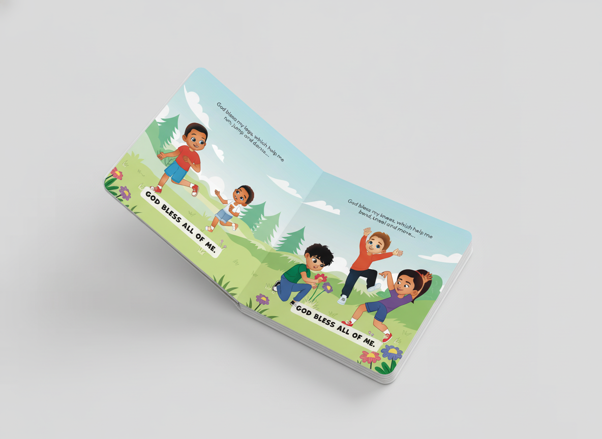Through simple, rhythmic lines like “God bless my eyes which help me see… God bless all of me” and “God bless my legs which help me run… God bless all of me,” this charming book gently teaches children to notice, appreciate, and give thanks for the incredible bodies God lovingly designed—while praying for His blessing over every part.